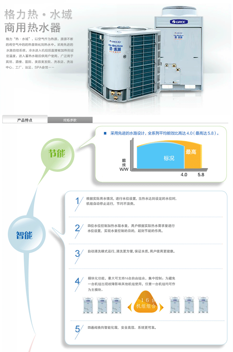 格力“热·水域”,商用热水器,以空气作为热源,源源不断的将空气的热量转化到热水中。采用先进的水路自控系统,冷水进入机组后直接被加热到设定温度,进入蓄热水箱后供用户使用,广发用于旅馆、宾馆、酒店、医院、泳池、美容美发店、洗衣店、SPA会馆、桑拿浴足、工厂、集体宿舍、公寓等。