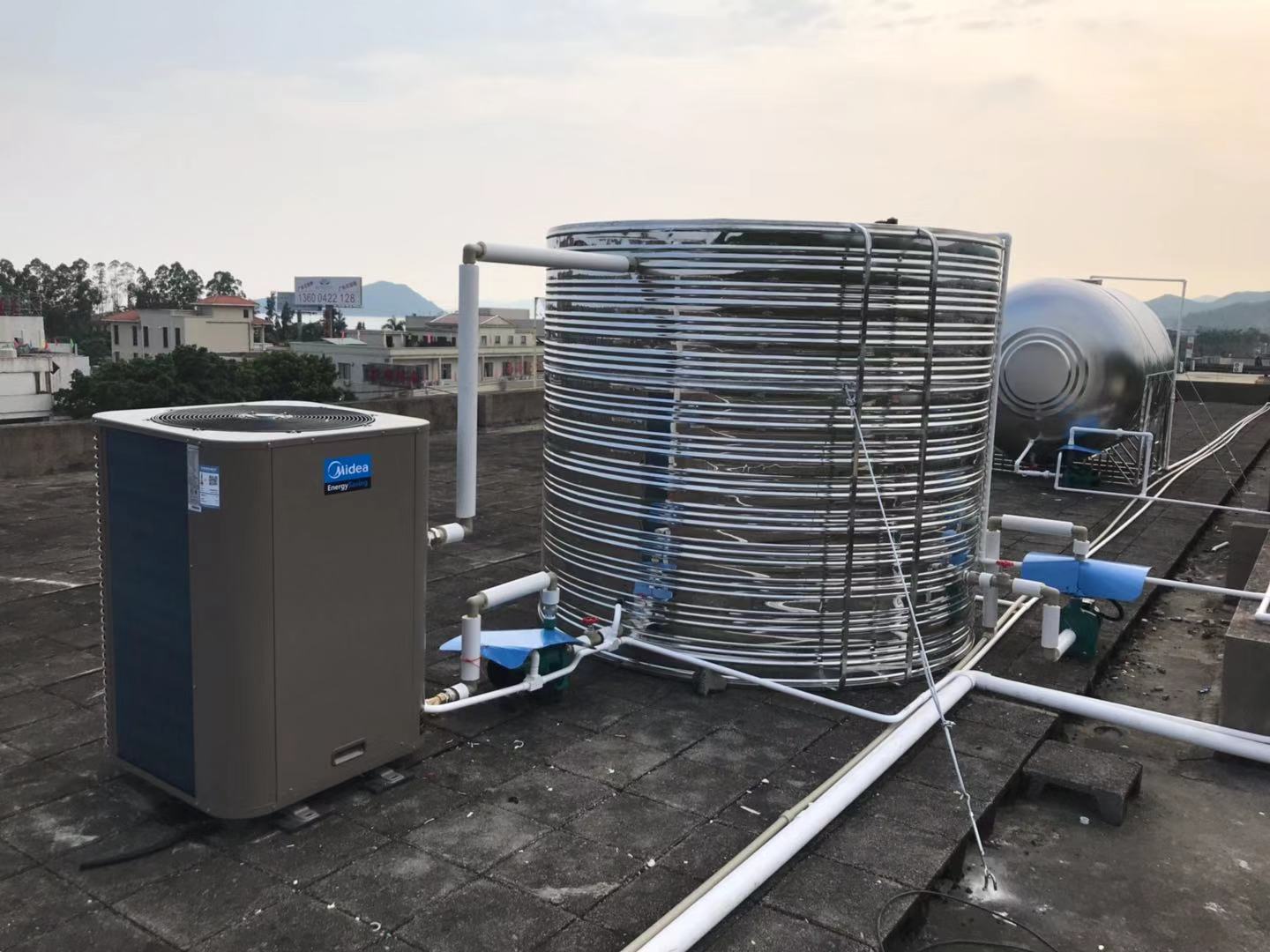深圳市深汕合作区机器人小镇市政道路和水系整治建设工程举行开工仪式。该项目由中电建生态环境集团公司、中国电建集团西北勘测设计研究院有限公司;深圳市水务规划设计院股份有限公司、中国水利水电第五工程局有限公司、中国水利水电第七工程局有限公司、全过程咨询单位共同参与建设。项目为中国水利水电第七工程局有限公司项目部集中临建生活用热水。约有80人用水按每人每天用50度的热水50升计算,每天约用热水4吨。系统采用一台美的RSJ-200/MS-540V1循环式5匹主机配一个5吨保温水箱及一套全自动控制系统。考虑项目地处海边我方特意为设备加固处理。深汕合作区空气能中央热水器系统--400 0755 258