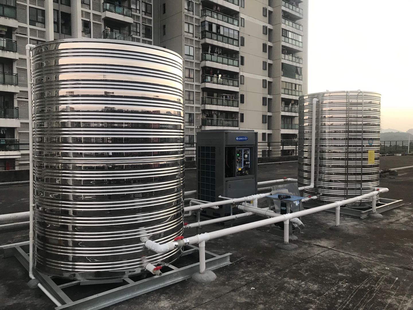 该项目为泰辉位于观澜泗黎路倍利得工业园内的员工宿舍中央热水工程,原宿舍采用中央空调余热供热水,因年限较久余热回收系统故障,且冬天中央空调开启时间短不能满足员工热水需求,根据实际情况系统采用两台格力牌最新款410雪种循环机组10匹2台配4个五吨水箱。